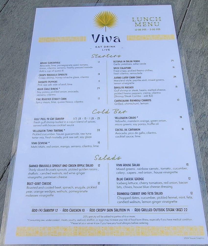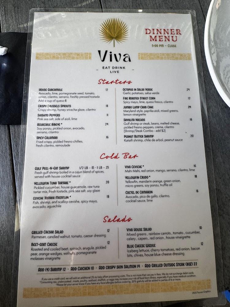 Viva offers a delightful blend of local flavors and traditional dishes. The menu showcases a variety of options, from appetizers to desserts. Start with house guacamole or spicy calamari. Tacos remain a highlight; try the ribeye or cauliflower tacos for a satisfying meal.